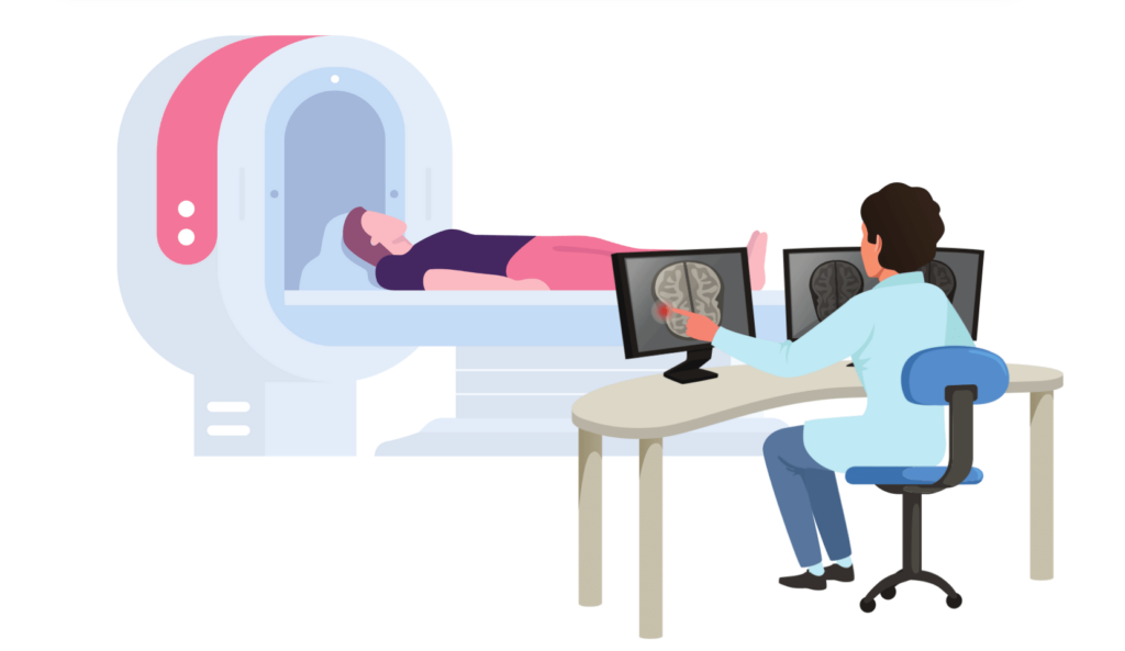 MRIとはMagnetic Resonance Imaging (磁気共鳴画像診断)の略です。強力な磁石と電波で色々な体の断面を画像にして診る事ができます。体内にある水素原子を電磁波の力で振動させ、原子の状態を画像にします。
