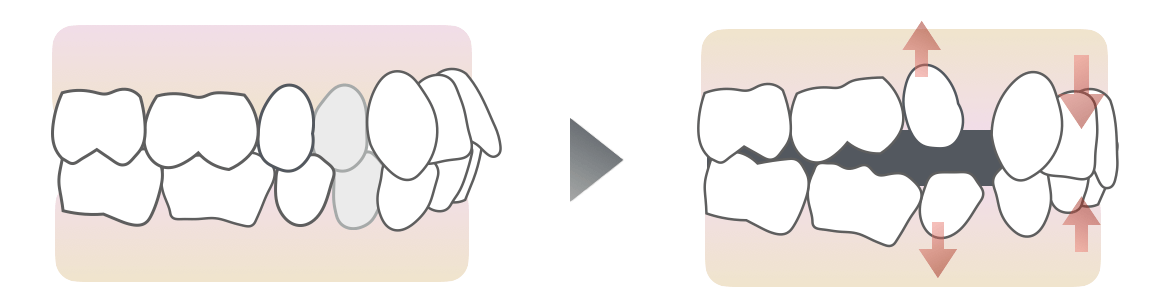 ボーイングエフェクトの最初は、矯正装置が付いている歯の頭の部分(歯冠)のみが移動し、歯の根の部分(歯根)の移動が追いついてこないことで発生します。そのまま、抜歯空隙に向かって傾斜していってしまうことで悪化していきます。