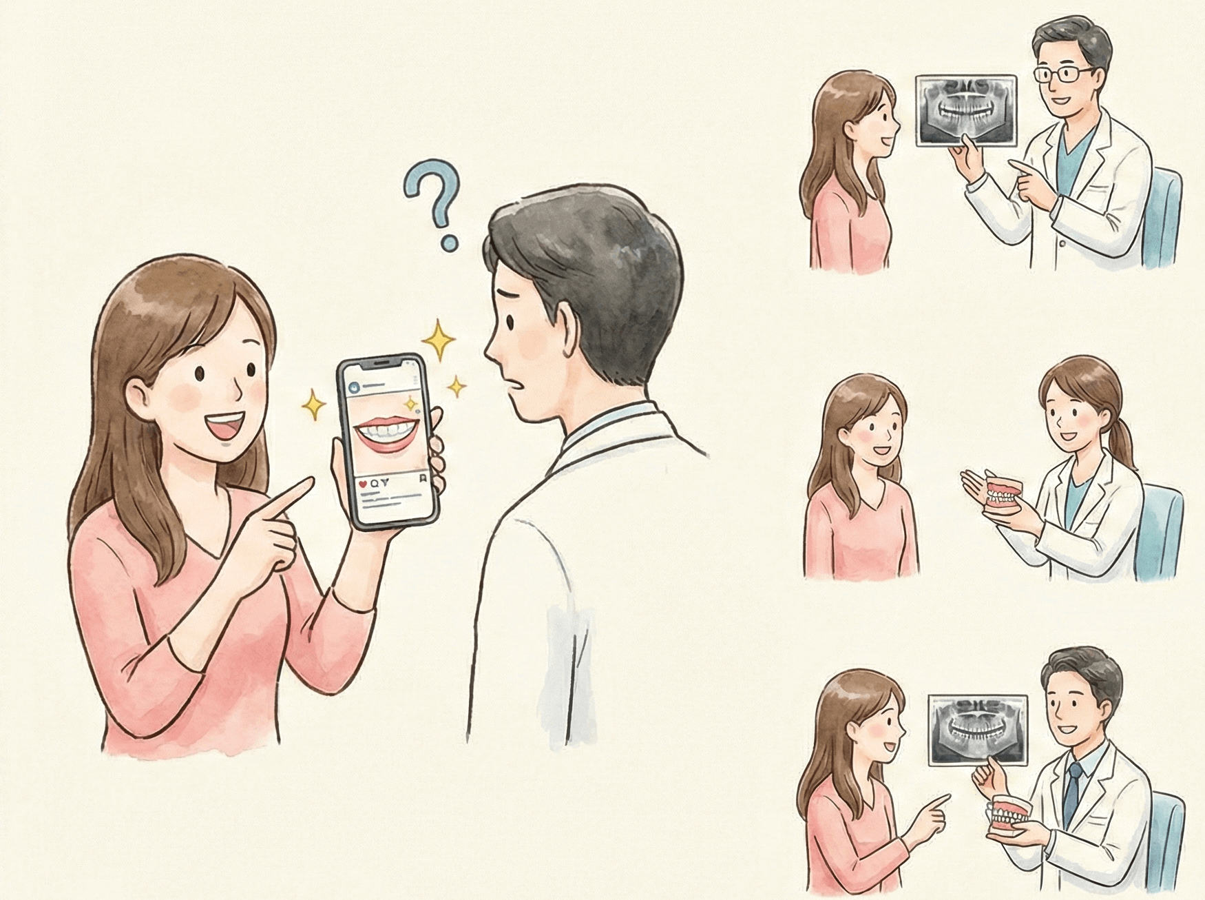 複数の医院で相談することも良いでしょう。ただし、「希望する治療法をやってくれる医院」を探すのではなく、「自分の状態を正確に診断し、最適な治療法を提案してくれる医院」を探すという視点で選んでください。SNSで見る美しい症例写真は、確かに魅力的です。しかし、それはその治療法がうまくいった一例であり、すべての人に同じ結果が得られるわけではありません。ご自身の骨格、歯の状態、年齢、生活環境などを総合的に考慮した上での判断が必要です。写真だけで判断するのではなく、実際に診察を受けて、自分の状態に合った治療法を見つけることが大切です。