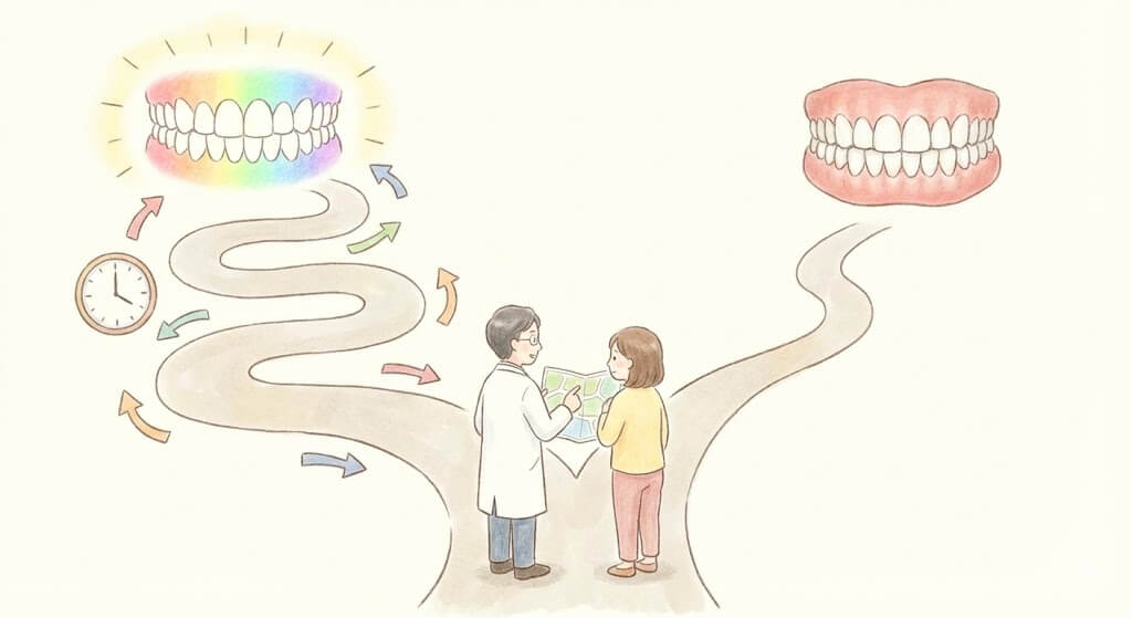 これを「妥協」と捉える方もいらっしゃるかもしれません。しかし、医療における賢明な判断であり、リスクを回避しながら良好な結果を得るための戦略でもあります。限られた時間の中で、患者さんの歯と歯周組織の健康を守りながら、最も良いバランスを見つけることが大切なのです。