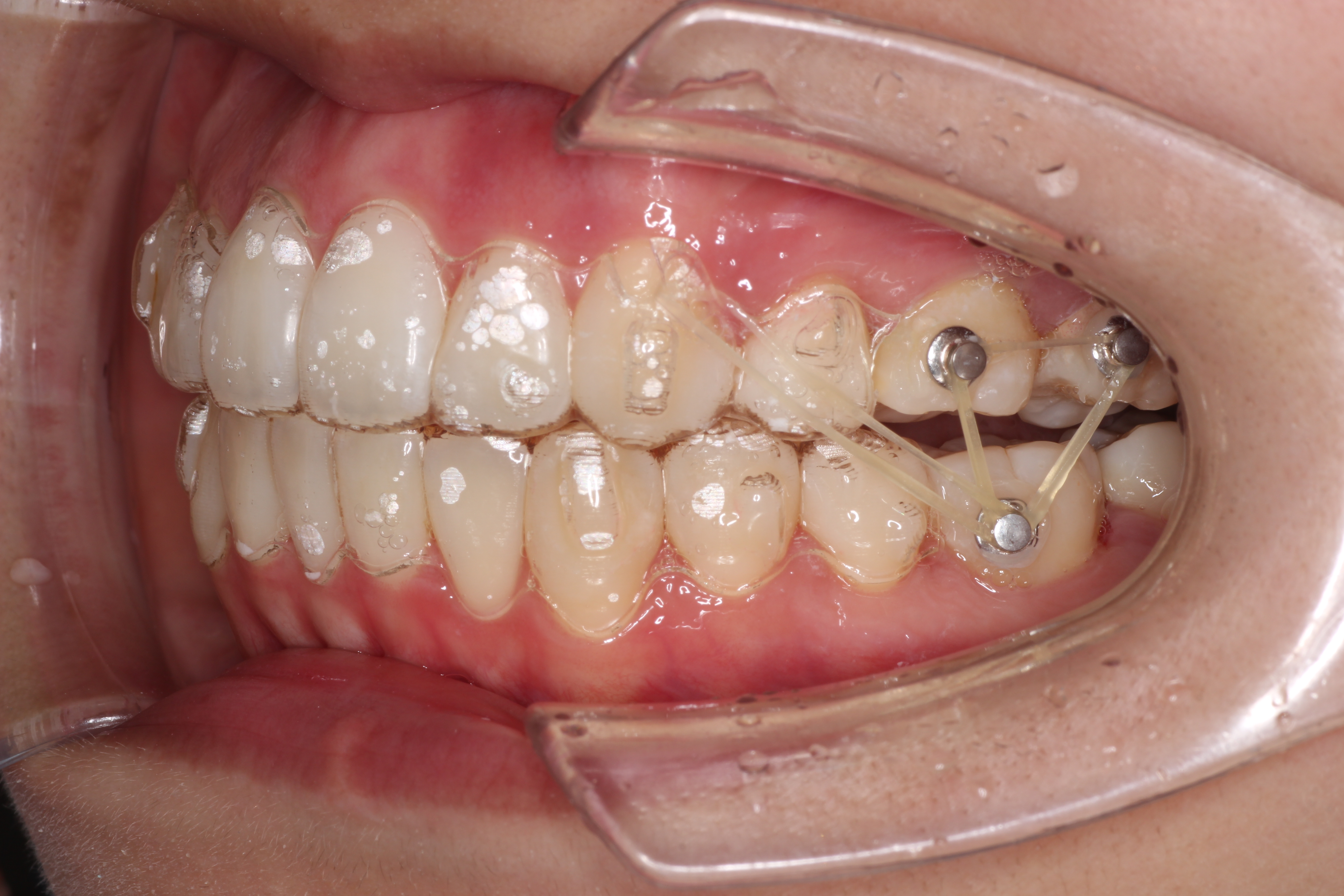 マウスピース型矯正装置(インビザライン・薬機法対象外)は遠心移動と呼ばれる、奥歯から1歯づつ移動させる方法が得意とされています。この方法を行うためには、顎間ゴムをマウスピース装着時に上下にかけ続ける必要があります。マウスピースはしっかり使用していても、この顎間ゴムの使用をおろそかにしていると、後方移動が成功せずそれまでの治療期間が無駄になる可能性もあります。