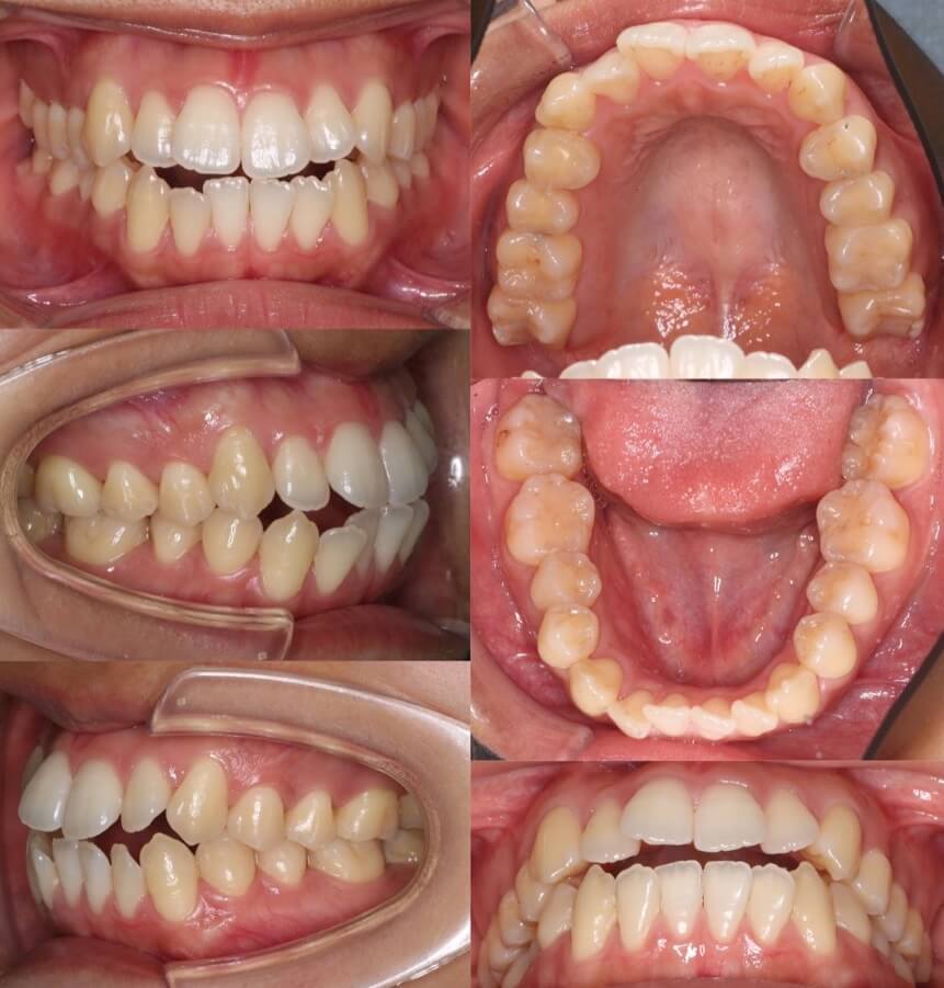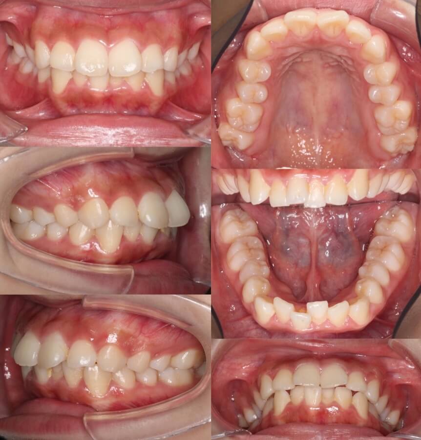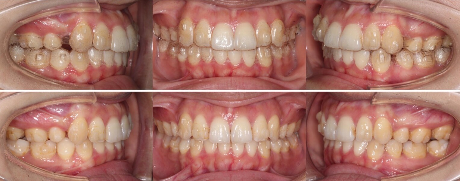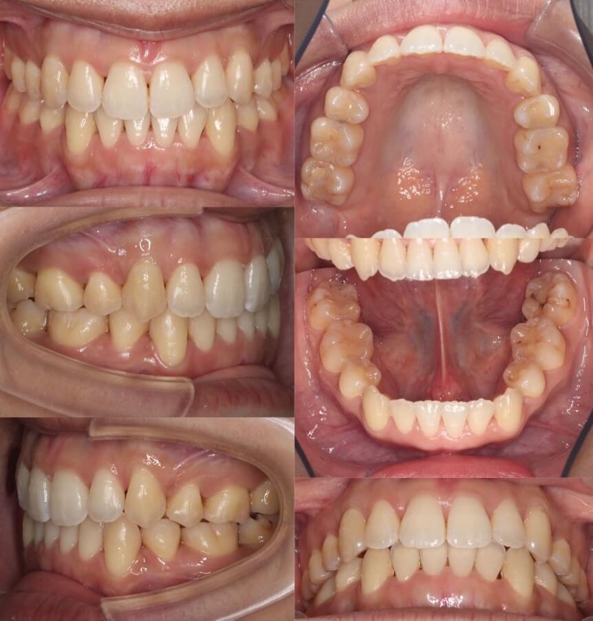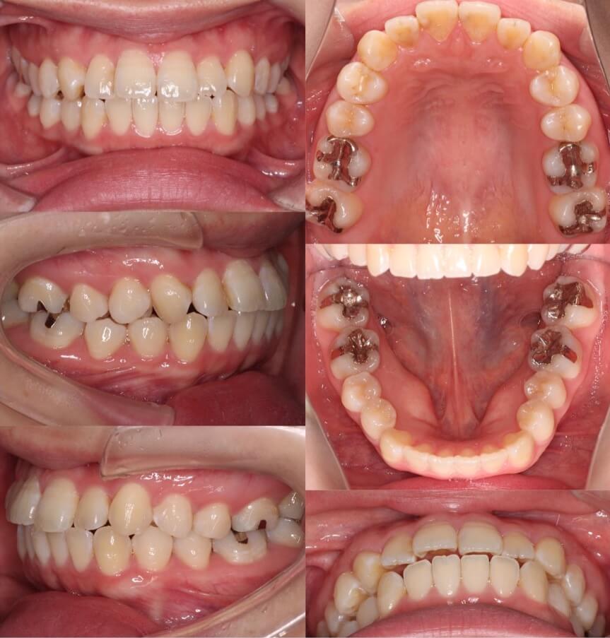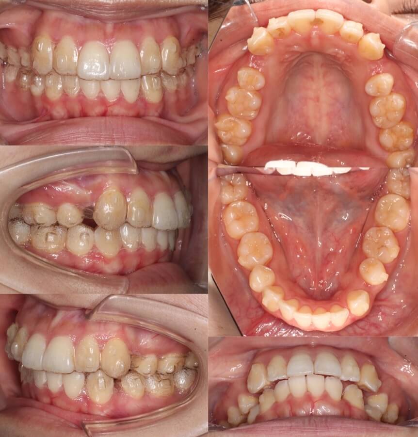 横顔のバランスがそこまで悪くなかったため抜歯か非抜歯か迷ったケースです。結局、患者さんが口元の後退を望まれたため、親知らずを残し小臼歯を抜歯することとしました。ワイヤー矯正装置と比較してマウスピース型矯正装置は、前歯が引っ込む量が少なくなるためあえてマウスピース装置を使用しました。