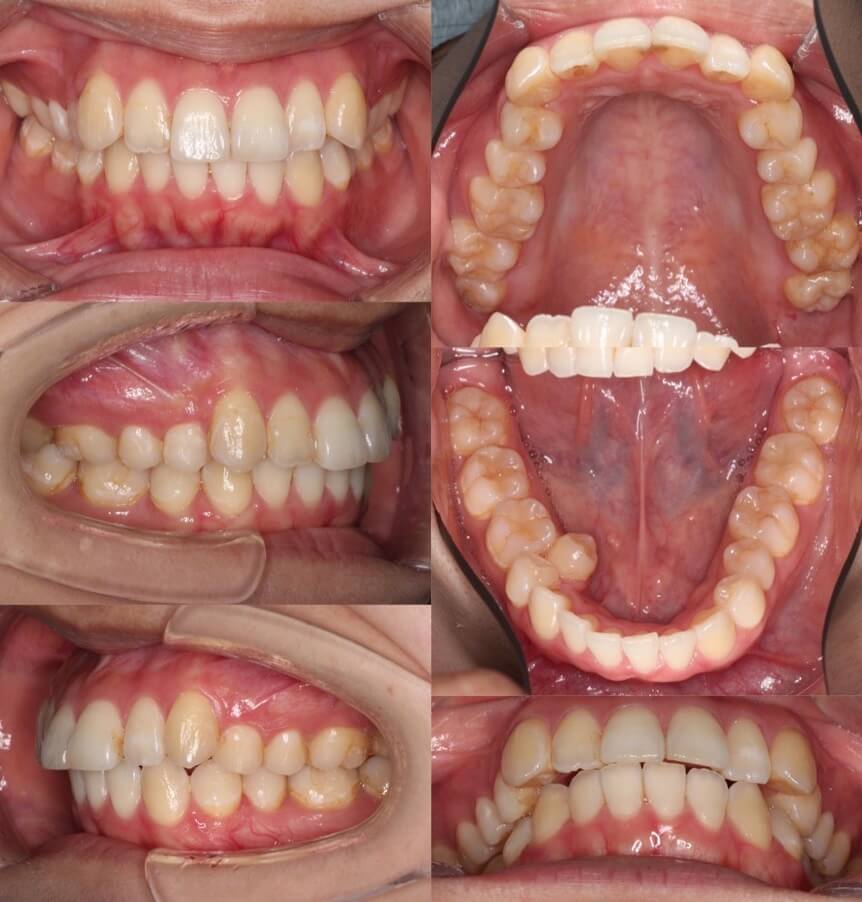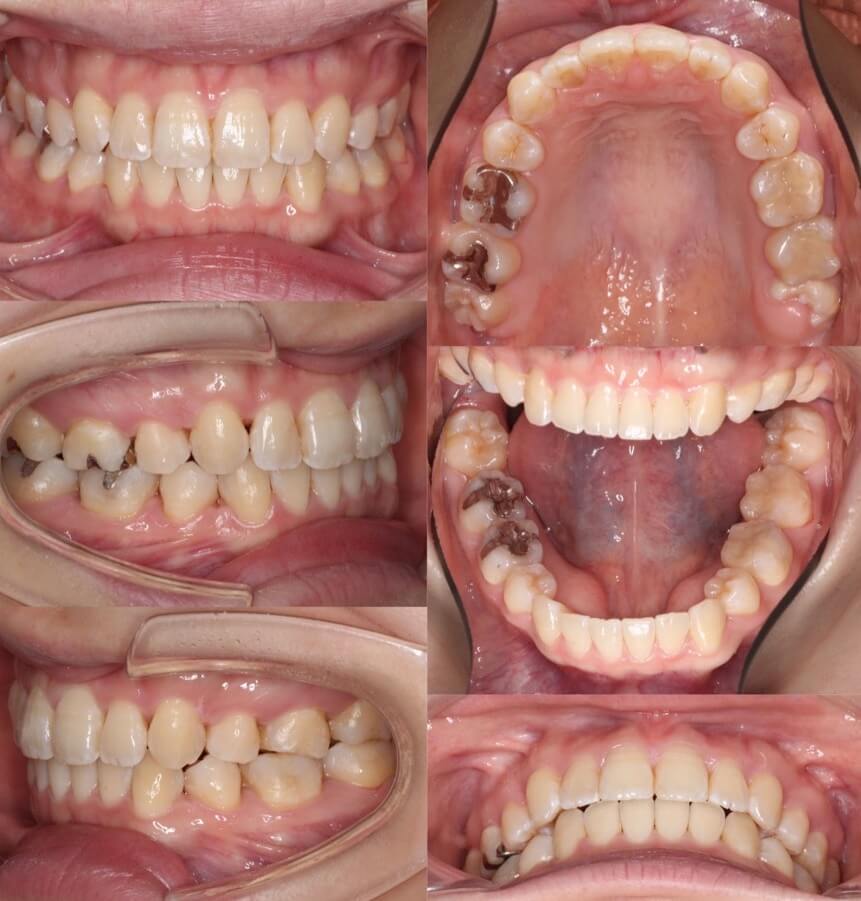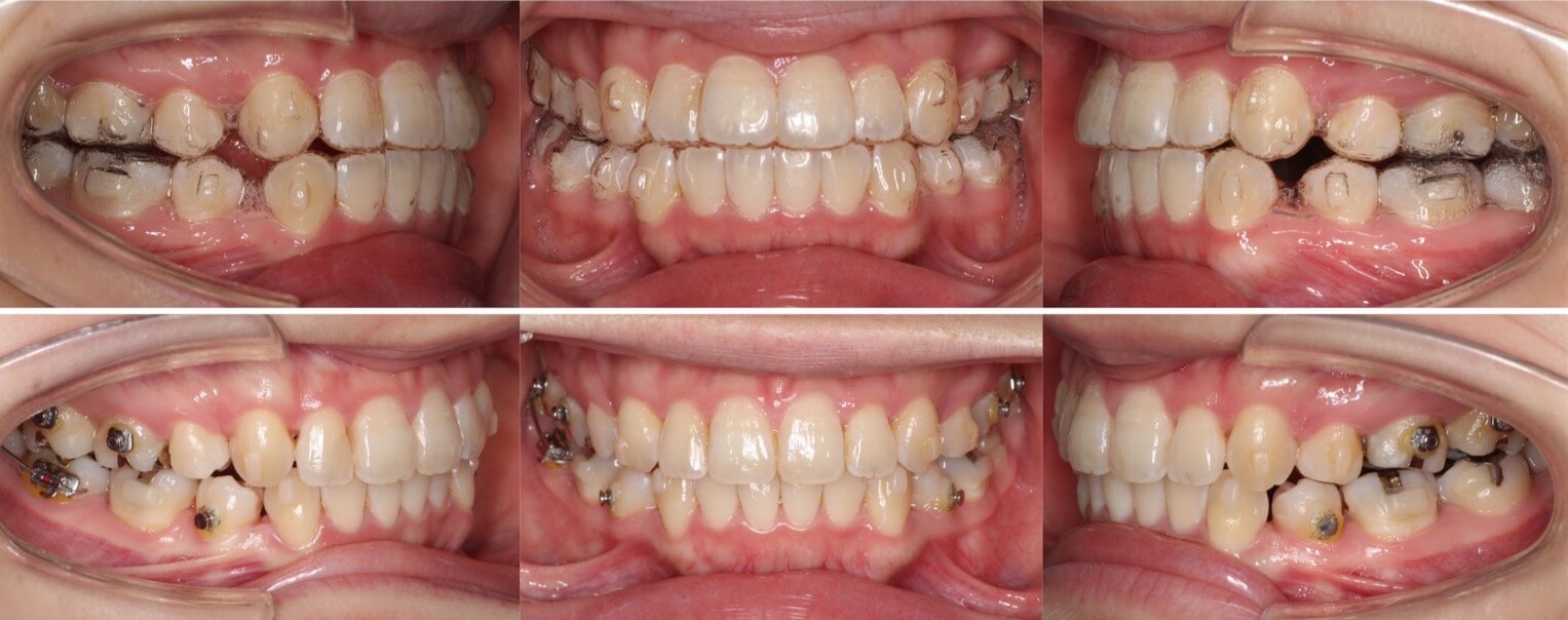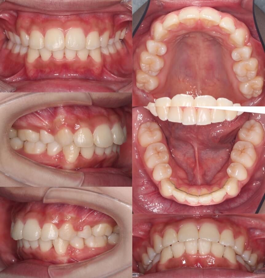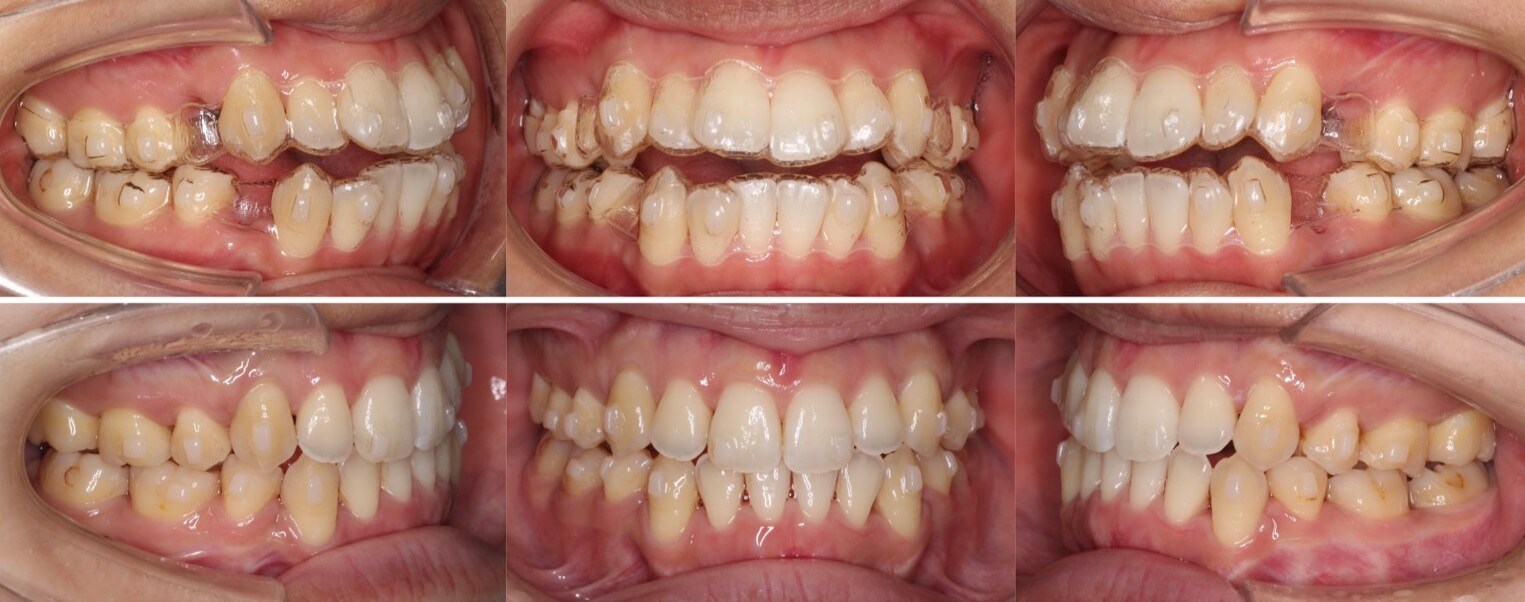 横顔のバランスがそこまで悪くなかったため抜歯か非抜歯か迷ったケースです。結局、患者さんが口元の後退を望まれたため、親知らずを残し小臼歯を抜歯することとしました。ワイヤー矯正装置と比較してマウスピース型矯正装置は、前歯が引っ込む量が少なくなるためあえてマウスピース装置を使用しました。
