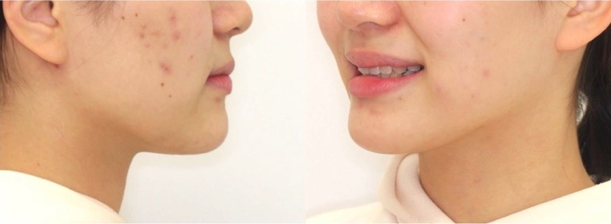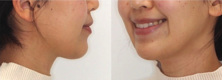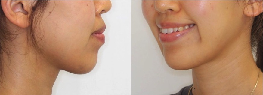 「口先の突出」だけではなく、「アゴ先を作りたい」という希望で、上下小臼歯を抜歯した矯正治療を行いました。もともと前歯が見えにくいタイプであったため、前歯を後ろに引きすぎないよう奥歯の固定を弱めに設定しました。