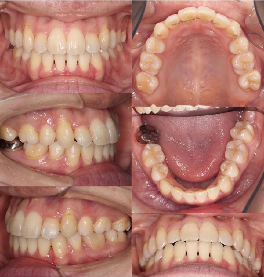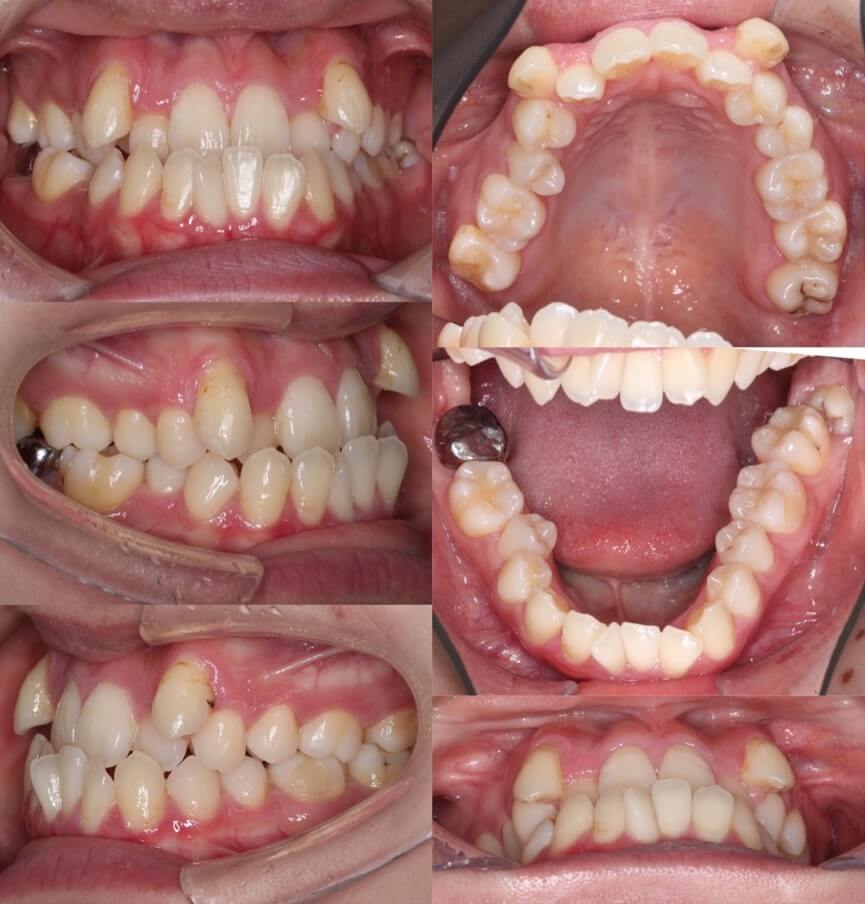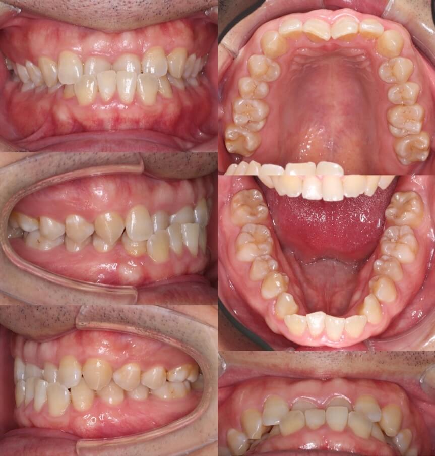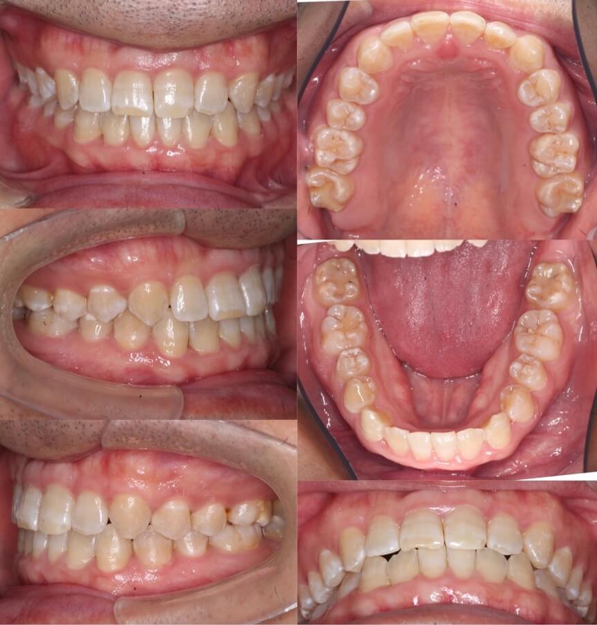 右半分の前歯のかみ合わせが反対咬合になっているケースです。また下あごの形の非対称もあり正中線も上下であっていません。下の歯並びをIPRを加えながら後方移動させることで前歯を後ろに押し込みかみ合わせを改善しました。