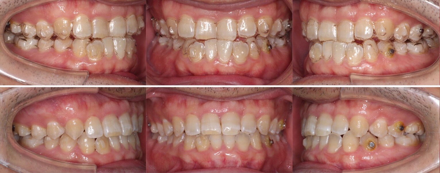 反対咬合症例をマウスピース型矯正治療で改善する場合は、顎間ゴムと呼ばれるゴムの使用時間が非常に大切になります。マウスピース装着時は必ず併用してもらう事をお願いしました。下の歯並びは徐々に後方に動いていく事で、スペースを作っていき最後に前歯を一気に後方移動します。