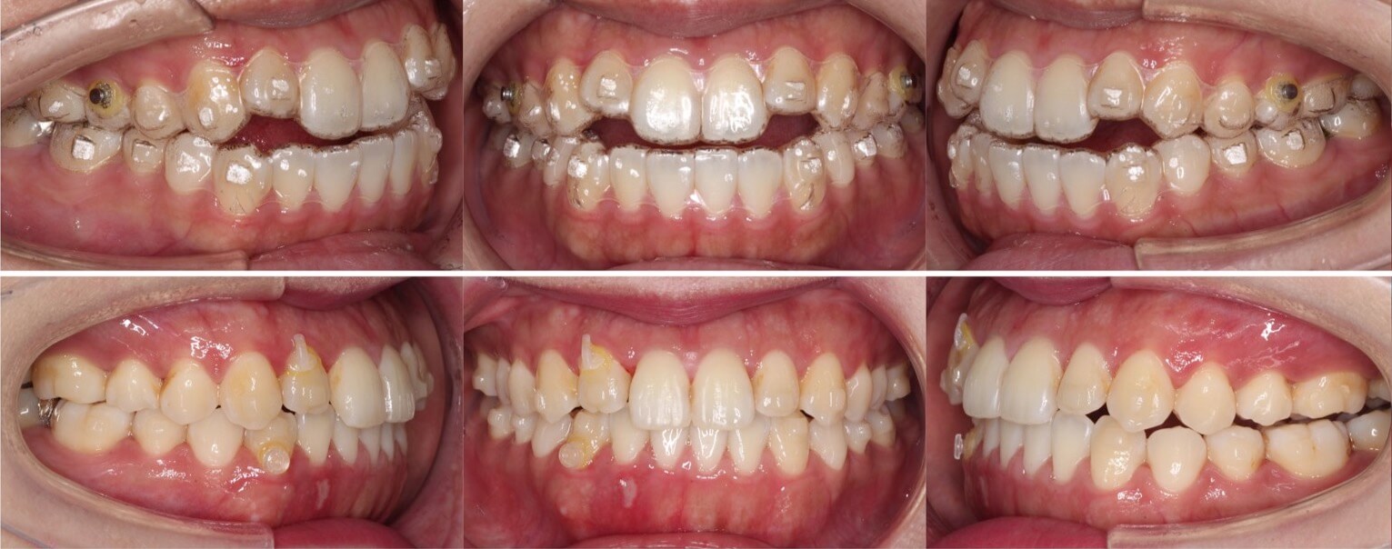 反対咬合は、奥歯に負担がかかるため、患者さんの奥歯は治療歯が多くダメージを受けている状態でした。受け口がコンプレックスで、人前で上手く笑えないとおっしゃっていた患者さんも、治療終了後は満面の笑みになってくれました。
