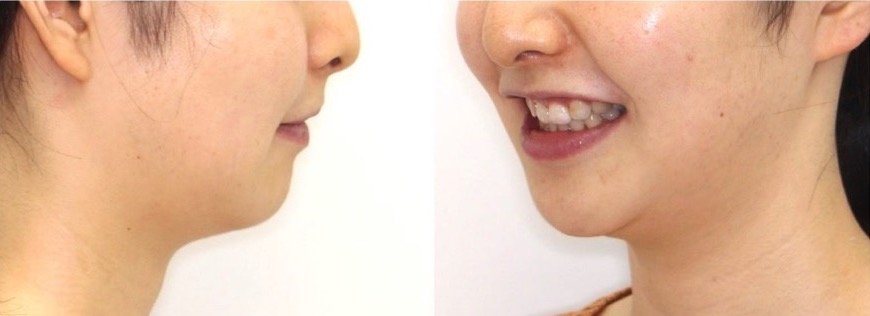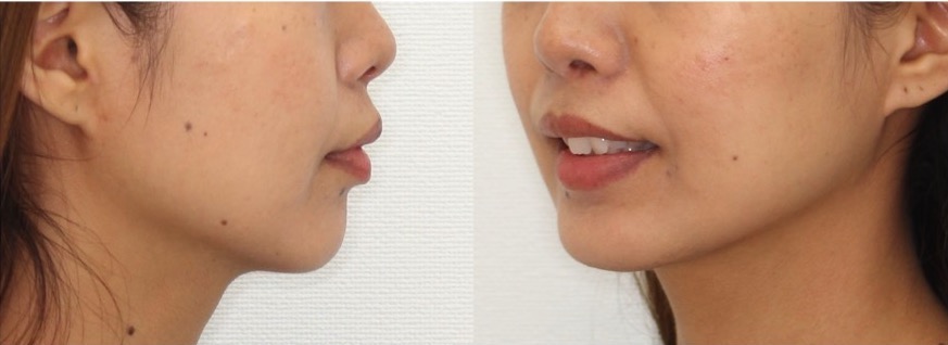 下の前が完全に見えない過蓋咬合です。口呼吸も併発しており口唇の突出も見られます。このようなケースは機能的改善効果もある機能的マウスピース矯正装置(プレオルソ)が効果を発揮します。前歯の噛み合わせ改善後も使用頻度を落としながらは使用し続ける事で、正しい位置に生え変わります。口唇に筋力がつき、横顔も引き締まりました。