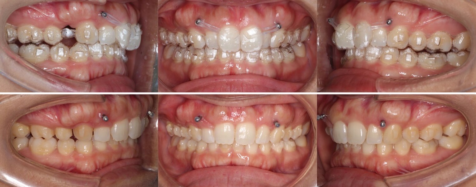 アンカースクリューを上あごの歯肉に設置し、ゴムで前歯を上方牽引した事が功を奏し何とかマウスピース型矯正装置のみで治療を完了させる事ができました。