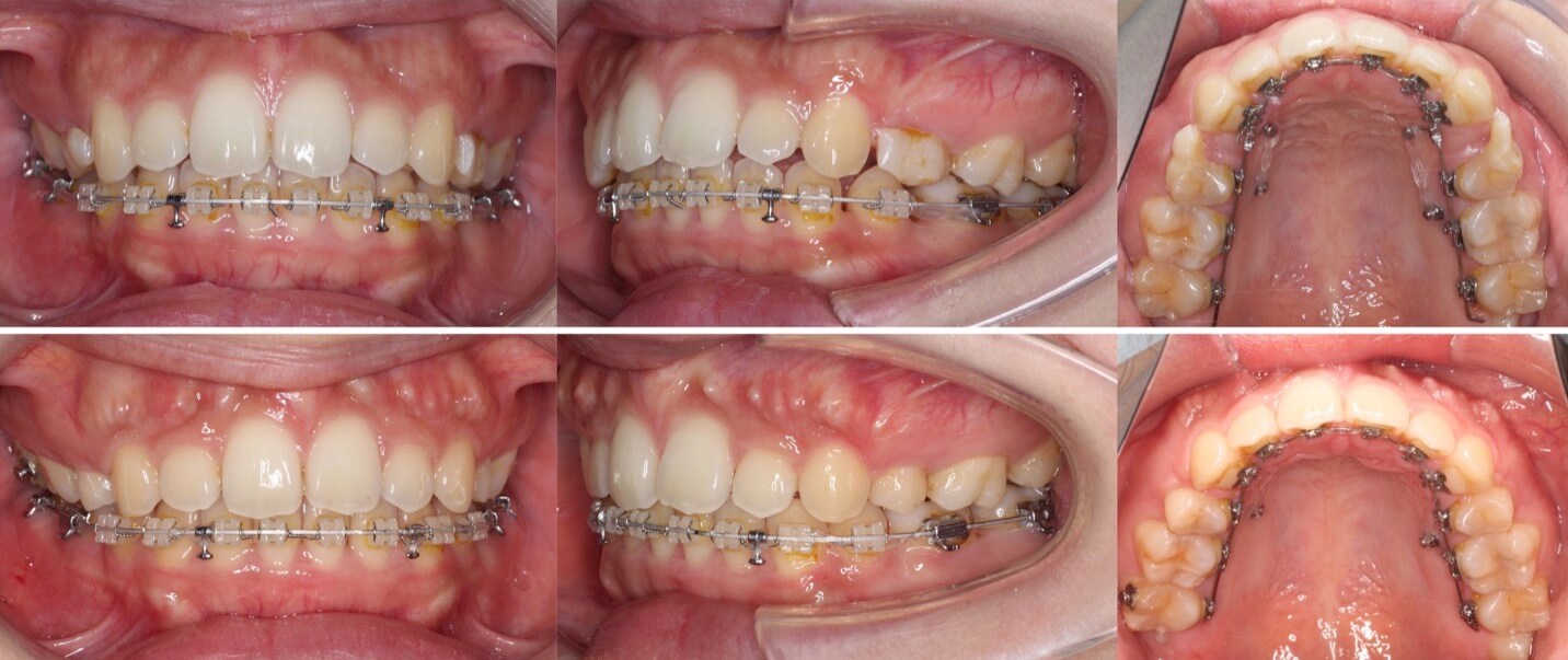 上顎前突ケースです。上は第一小臼歯、下は虫歯があった第二小臼歯を抜歯し、上の前歯を7mmほど後ろに引っ込めました。本来は上下左右同名歯を抜歯する方が良いのですが、虫歯や補綴物ある場合は、柔軟に決定します。また、上顎前突の改善には下は奥歯を動かしやすい第二小臼歯を抜歯した方が有利な場合もあります。