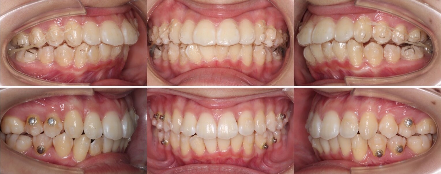 かみ合わせが深い過蓋咬合も併発しているタイプです。このようなタイプは歯冠(歯の頭の部分)が短く、歯の移動コントロールが非常に難しいです。また、かむ力も強かったので、中々歯も動かず治療期間が長期化してしまいました。