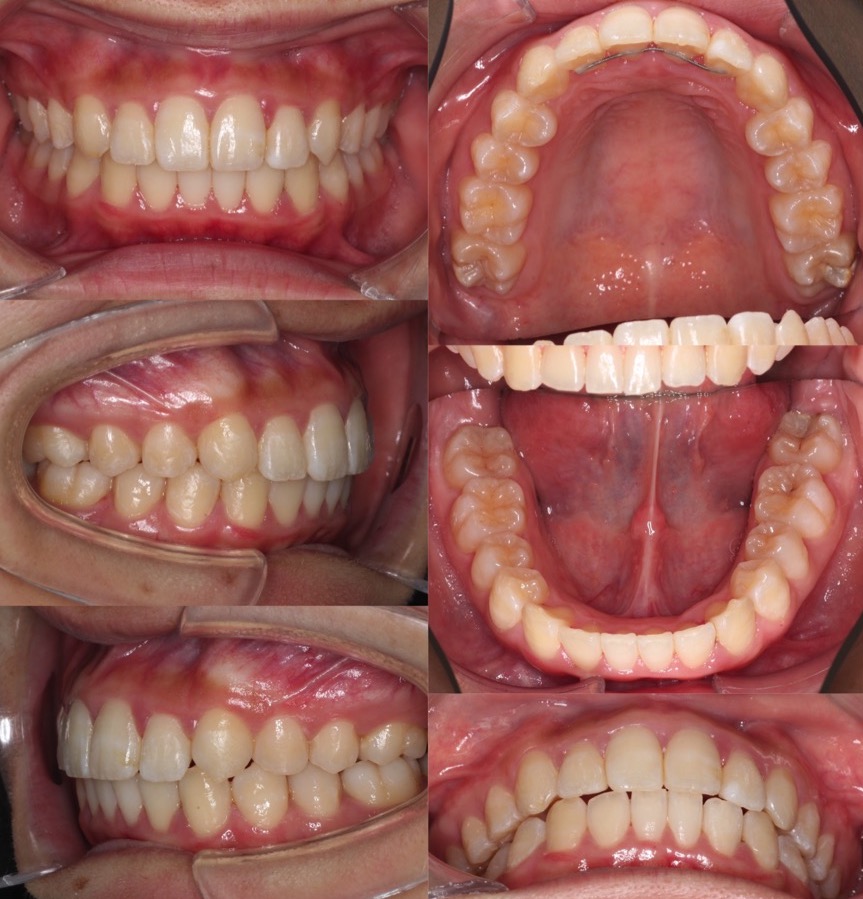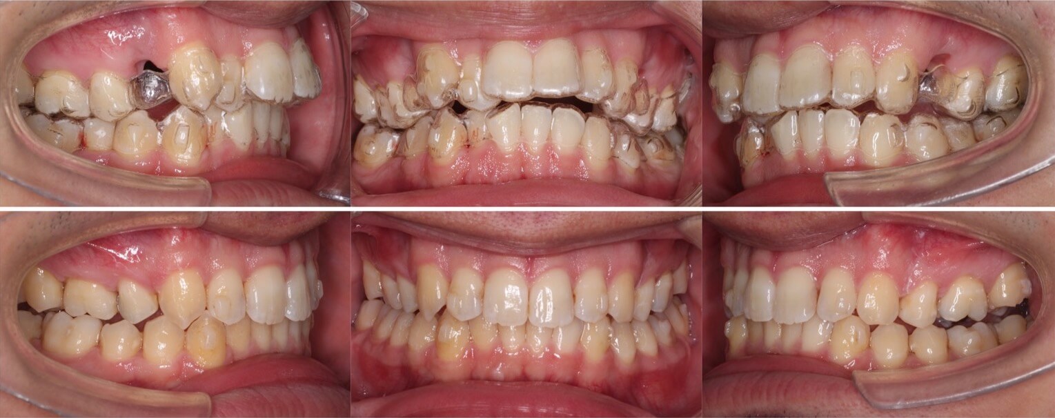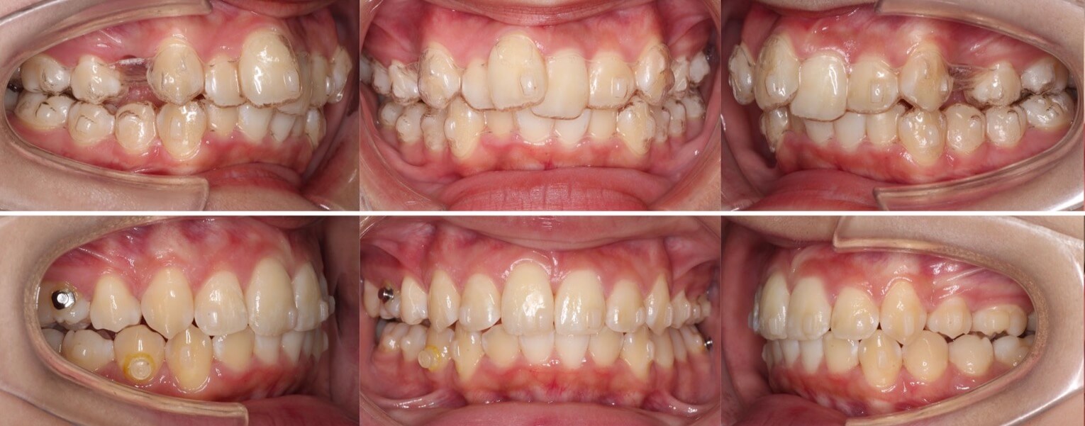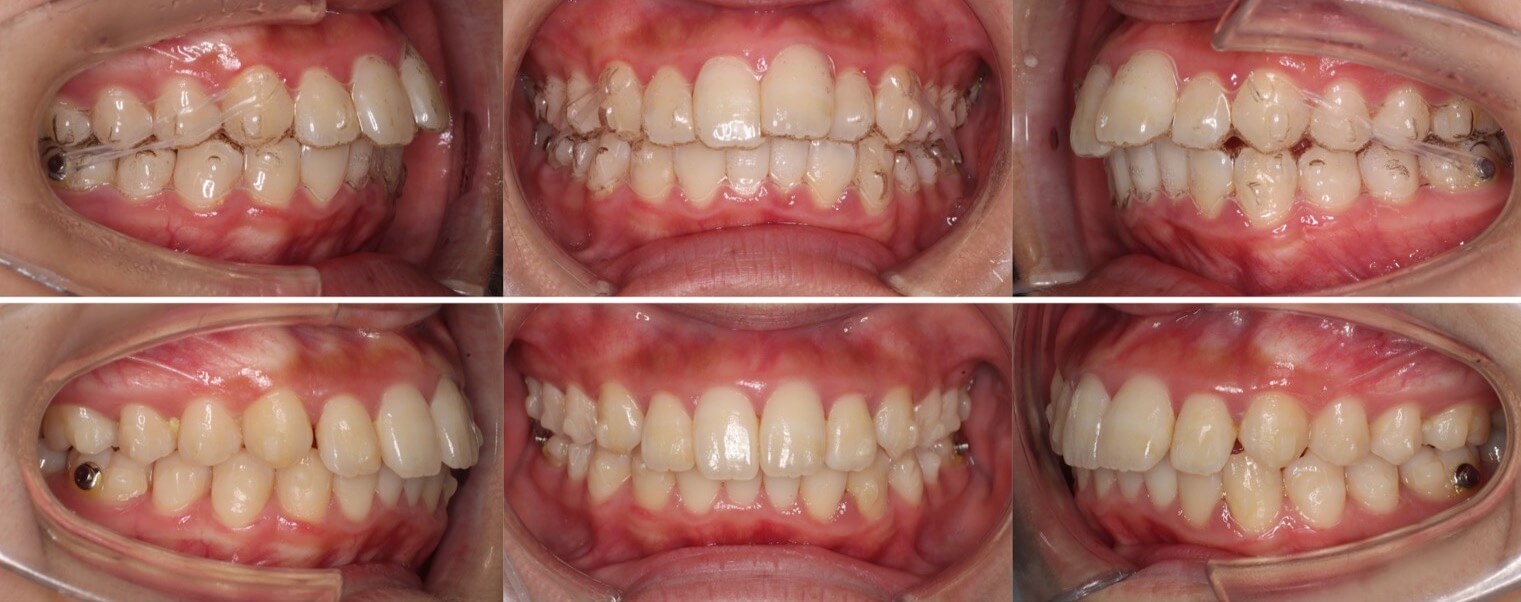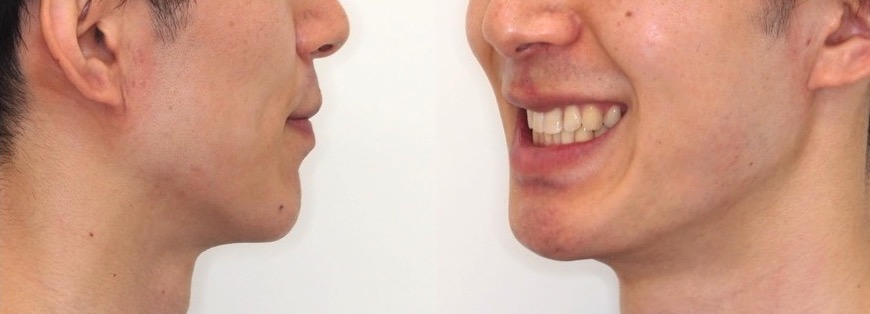 どうしても抜歯をせずに出っ歯を治したいという患者さんの希望により、マウスピース型矯正装置(インビザライン・薬機法対象外)のMAという装置を使用して治療したケースです。奥歯に下の歯並びを前方に移動させるバイトウィングという特殊な羽がついたマウスピースを使用しています。男子の場合は下顎の前方成長がうまくいけば、このように良好な治療結果も生まれます。