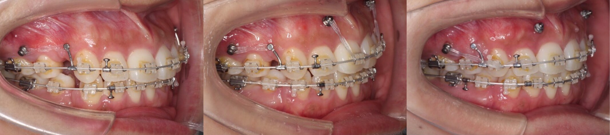 乳臼歯は本来あるべき永久歯よりサイズが大きい傾向にあり、抜歯後の空隙閉鎖には通常より時間がかかります。下のワイヤーを2重にして少し強めの力をかけて治療期間の短縮を計画したのですが3年弱かかりました。