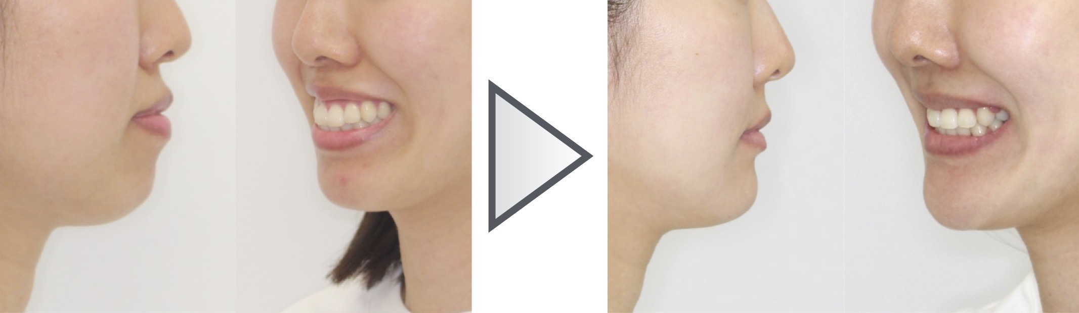 過蓋咬合を伴わないガミースマイルのため、治療方針は難しくなります。歯科矯正用アンカースクリューを4本使用し、上顎前歯の圧下と下顎前歯の挺出でかみ合わせを崩さず歯茎の露出量を調整しました。小臼歯抜歯もおこなっているため、側貌も大きく変化しています。