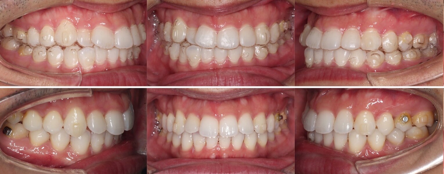 上の両側奥歯のシザースバイトと、左前歯のクロスバイトがあり、上下の歯がうまく噛めない状態を改善しました。噛み合わせの改善のため、見た目の改善が少ないため、モチベーションのキープが大変ですが、治療終了後は喜んでいただけました。